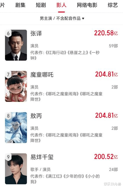 猫眼数据显示,他所主演电影的总票房达200.52亿,在所有演员中排名第九,如果除去哪吒、敖丙这两个虚构的角色,则排名第七。