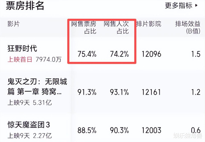 上映首日,《狂野时代》的网售票房占比75.4%,次日网售票房占比57.6%,后续更是降到了40%以下,而同期其它电影的网售票房占比普遍在90%左右。