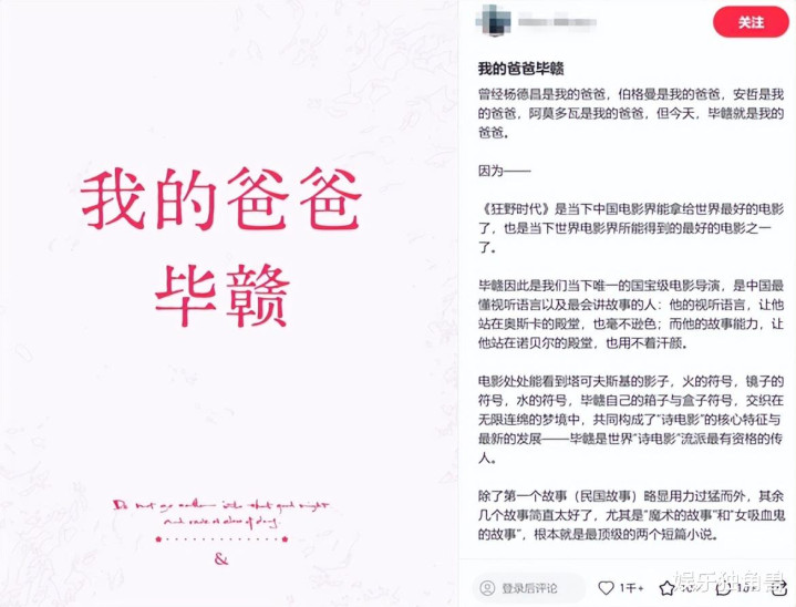 当然,也有一些毕赣电影爱好者,会表示“曾经杨德昌是我的爸爸,伯格曼是我的爸爸,安哲是我的爸爸,阿莫多瓦是我的爸爸,但今天,毕赣就是我的爸爸”,央视《今日影评》栏目也称“应保持更开放的心态去观看《狂野时代》”。
