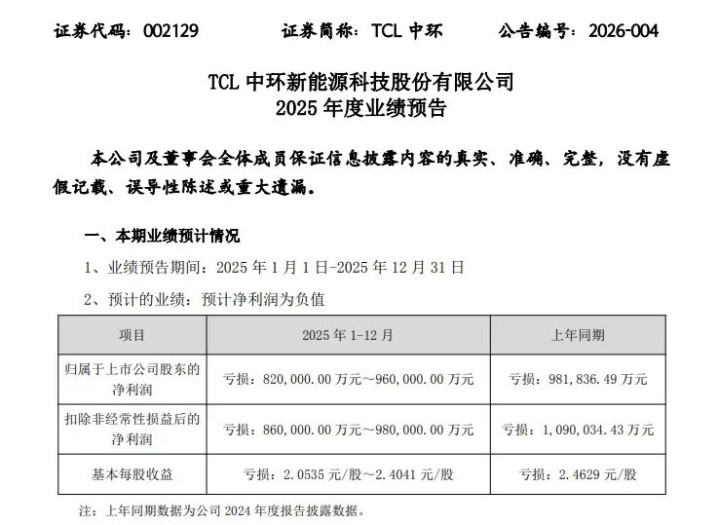 1月14日晚间,TCL中环发布2025年度业绩预告。公告显示,2025年TCL中环归属于上市公司股东的净利润亏损82-96亿元,较上年同期亏损98.18亿元;扣除非经常性损益后的净利润亏损86-98亿元,较上年同期亏损109亿元。
