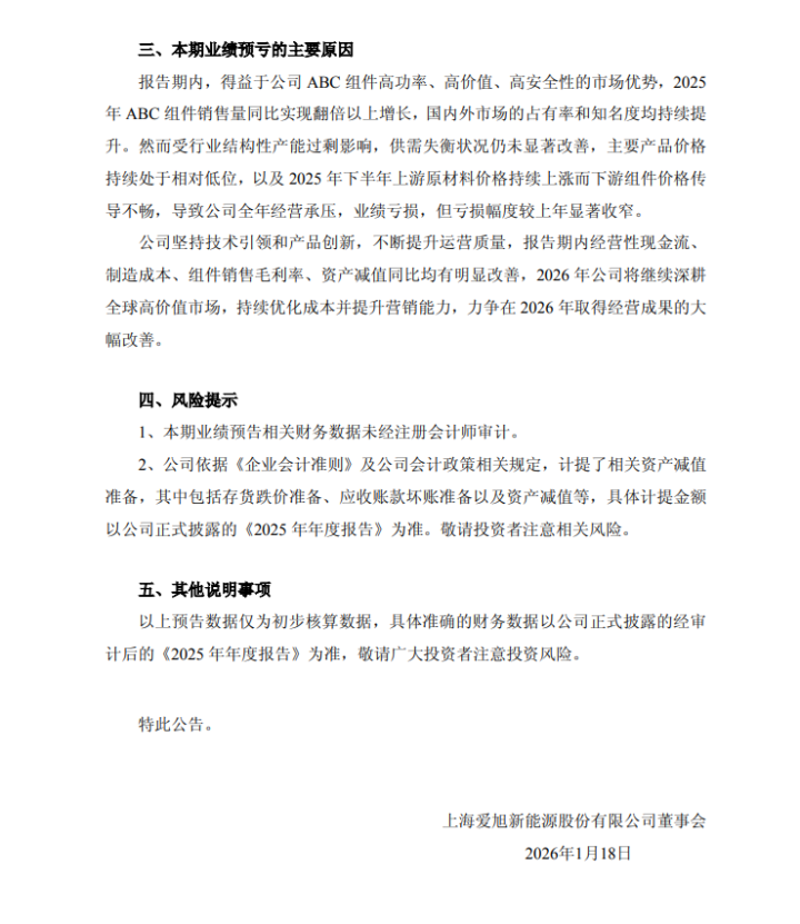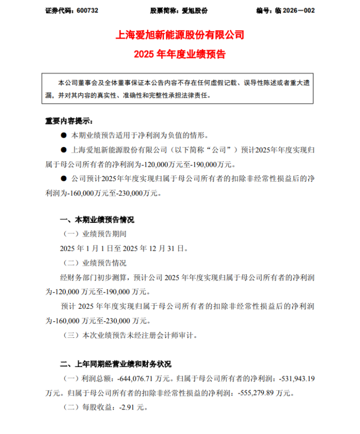 1月18日晚间,爱旭股份发布2025年度业绩预告。经财务部门初步测算,预计公司2025年年度实现归属于母公司所有者的净利润为-120,000万元至-190,000万元。预计2025年年度实现归属于母公司所有者的扣除非经常性损益后的净利润为-160,000万元至-230,000万元。