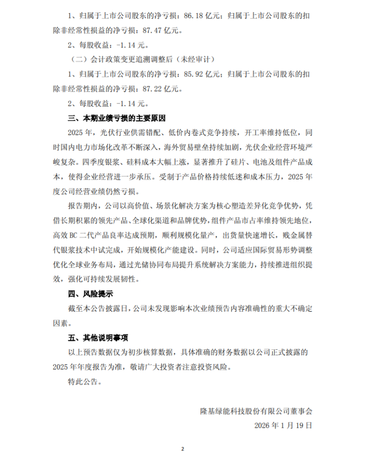 1月18日晚间,隆基绿能发布2025年度业绩预告。经财务部门初步测算,预计2025年度实现归属于上市公司股东的净亏损为60亿元到65亿元。预计2025年度实现归属于上市公司股东的扣除非经常性损益的净亏损为68亿元到74亿元。