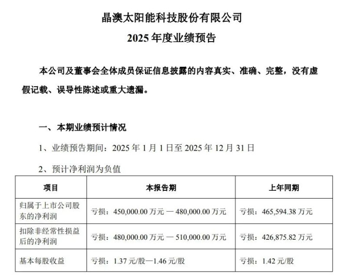 1月12日晚间,晶澳科技发布2025年度业绩预告。公告显示,2025年晶澳科技归属上市公司净利润为亏损45-48亿元,扣除非经常性损益后的净利润为亏损48-51亿元。
