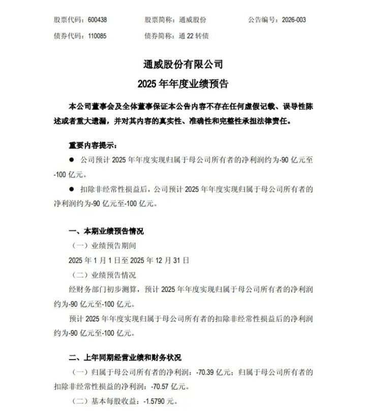 1月18日晚间,通威股份发布2025年年度业绩预告。公告显示,经财务部门初步测算,通威股份预计2025年年度实现归属于母公司所有者的净利润约为-90亿元至-100亿元。预计2025年年度实现归属于母公司所有者的扣除非经常性损益后的净利润约为-90亿元至-100亿元。